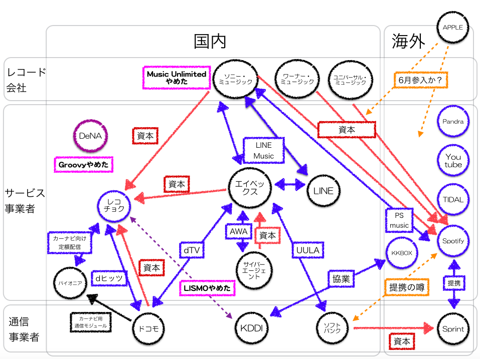 なにはともあれ、定額制音楽配信サービスは登場人物が多いので、まずは相関図を作てみました。