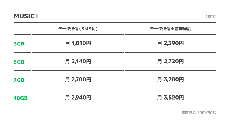 最後に本日から提供が始まったLINEモバイルのMUSIC+プランの料金体系を紹介しておきます。