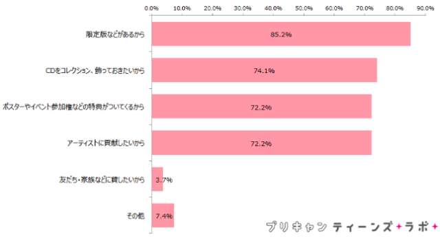 しかしながら、「CDを購入する」と回答した人にその理由を尋ねると、最も多かったのが「限定版などがあるから」(85.3%)という回答であったように、もはやCDに「音楽としての価値」はほとんどなく、コレクションアイテムになっていることがわかりますね。