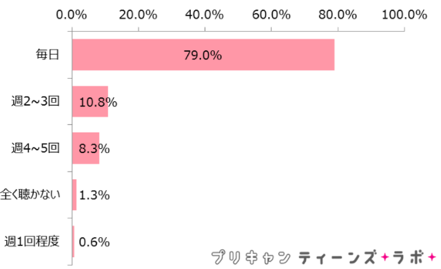音楽を聴く頻度についての調査では、「毎日(79.0%)」聴くと回答した人が8割近くの結果となっており、音楽自体は変わらず高い需要があることが分かります。