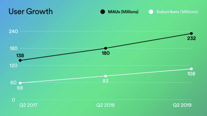 世界最大級の定額制音楽ストリーミング配信サービス「Spotify」が、2019年7月31日に、2019年第2四半期の決算を発表しました。それによると、プレミアムプランに加入している有料会員数が1億800万人に、月間のアクティブユーザー(MAU)は2億3200万人達したとのこと。成長が止まりませんね。