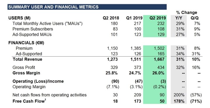 Spotifyといえば、創業から10年以上続いていた営業利益の赤字が、2018年第4四半期に初めて黒字に転換したことで話題になりましたが、直近の営業利益は再び赤字に戻っているようです。