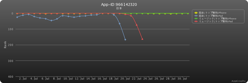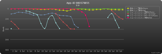 本日時点のランキングだけでは一概に比較できないとも思い、外部ツールである「AppGraphy」を利用し、過去1ヶ月間のランキング推移も調査しました。