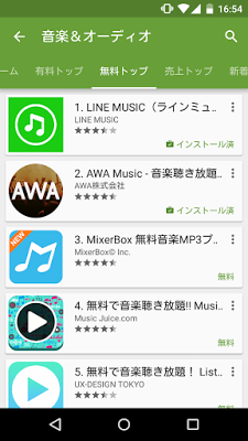 Google Playの「音楽&オーディオ」カテゴリでもLINE MUSICが1位で、AWAが2位ですね。